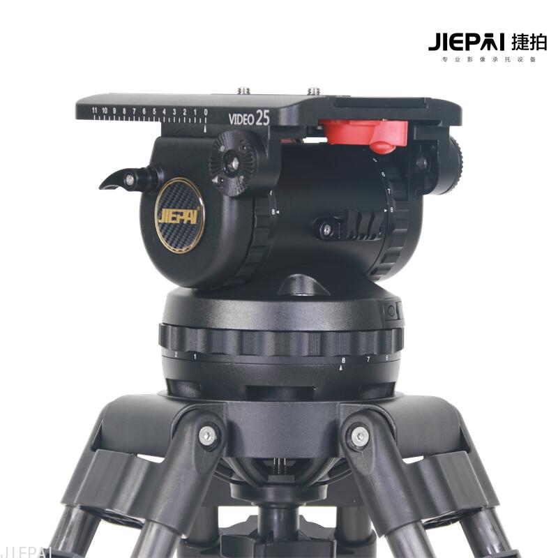 捷拍JIEPAI JP-v25液压云台三脚架。云台CNC精密加工,零件全部做阴阳极氧化处理增加硬度和耐磨损度。150MM通用性碗口,24MM大管径脚架,保证脚架的稳定性,当前市场同型号管径最大 稳定性最好的脚架。采用进口阻尼脂,水平/俯仰阻尼8档可调,细腻的阻尼划分,使摄像师能快速变换阻尼的大小,在拍摄中可以保证平滑、无卡顿,快速找到适合您的阻尼手感使得云台的运动更为平滑,已可媲美国外品牌高端品牌的云台的操作手感,提供一个最佳的拍摄平台。8级平衡系统由先进的抗扭矩橡胶弹力系统构成,并添加3档动平衡释放扳档,真正实现0-45KG大小机型通吃,避免承重小机型时弹力过大的尴尬处境,同时并没有牺牲动平衡的最大平衡力。坚固稳定,阻尼平滑有力,称得上高性价比电影电视剧脚架。150毫米双级三脚架,专业级别电影三脚架。