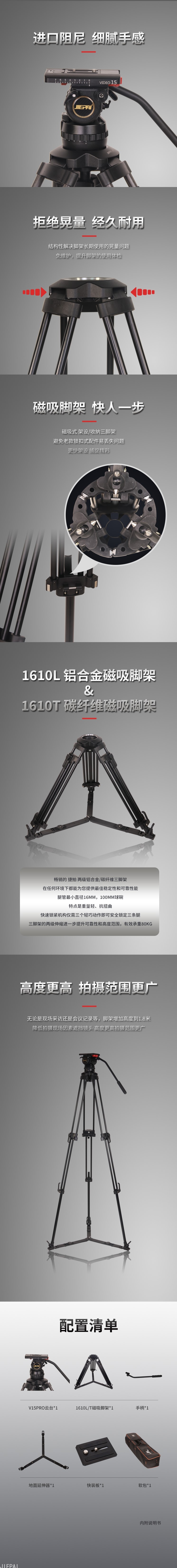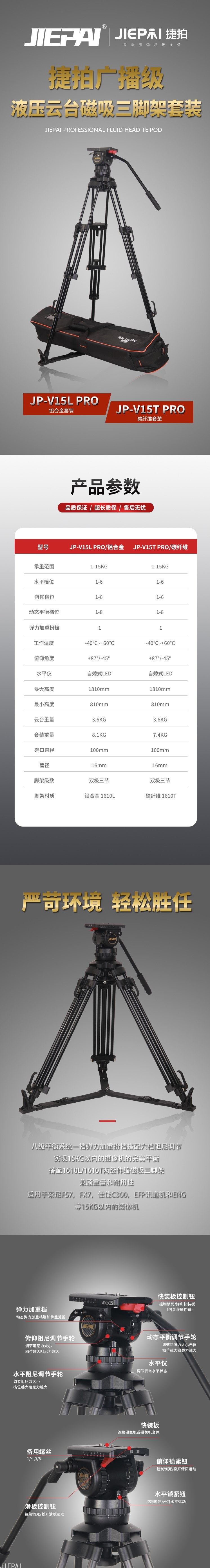 捷拍JIEPAI JP-v15液压云台三脚架。100MM通用性碗口,19MM大管径脚架,保证脚架的稳定性,当前市场同型号管径最大 稳定性最好的脚架避免头重脚轻。采用进口阻尼脂,水平/俯仰阻尼6档可调,在拍摄中可以保证平滑、无卡顿,提供一个最佳的拍摄平台。8级平衡系统由先进的抗扭矩橡胶弹力系统构成,并添加1档动平衡释放扳档,真正实现0-15KG大小机型通吃,避免承重小机型时弹力过大的尴尬处境,同时并没有牺牲动平衡的最大平衡力。