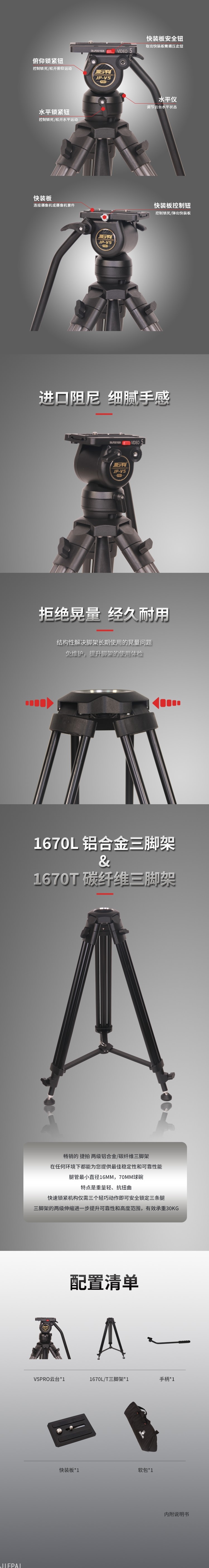捷拍JIEPAI JP-v5 液压三脚架作为专业摄影、摄像承托设备,75MM通用碗口三脚架锁键和连接部件设计采用经过特殊处理的增强尼龙材料,具有耐高温、防老化、韧性强等适应性。全新设计的液压云台采用进口新型阻尼材料使其承重系数大大提高,摄像机在5kg范围内可轻易达到平衡位置,保障了拍摄过程中的稳定性和可靠性,带给您极致顺滑的摇摄手感。整体重量控制在5kg以内 ,便捷性满足单兵作战,满足于新闻采访和专题片拍摄摄像机的要求。