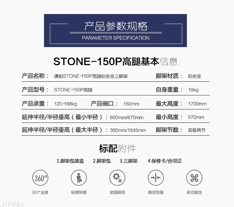 名称:JIEPAI捷拍 150P-H电影级别高腿三脚架